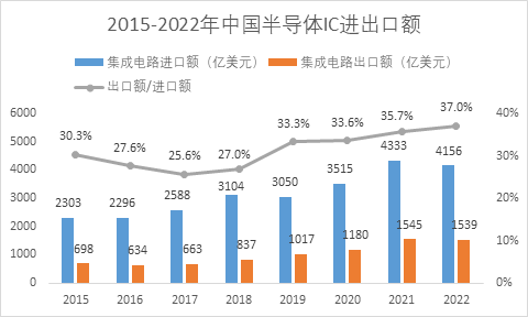中国集成电路仍以进口为主,国产替代空间巨大。根据中国海关总署数据,2022年中国进口的芯片总量为5384亿个,同比下降15.3%;进口金额4156亿美元,同比下降4%。2019-2022年,我国集成电路进口数量约为出口数量2倍,进口金额约为出口金额3倍,总体仍高度依赖进口。