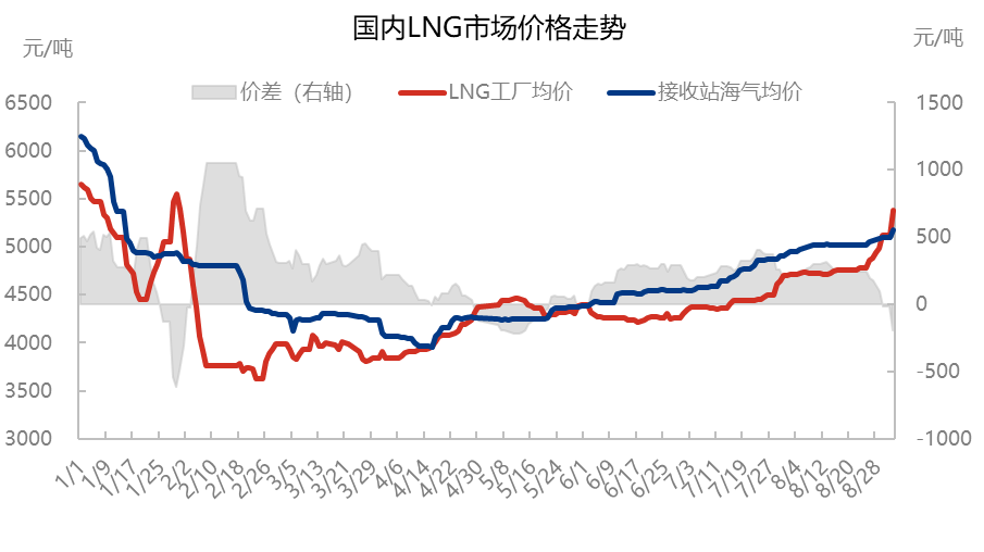 9月伊始,lng价格在涨至本轮高位的情况下,下游呈现消化不良状态,8月下旬陆续出现的补库需求消失,高企的价格仅剩加气站刚需用量支撑,提振乏力。接收站海气尚在补涨,但国产气工厂价格开始回落。截止今日,国内lng工厂均价5375元/吨,较上一日下跌3元/吨;接收站海气均价5231元/吨,较上一日上涨50元/吨。