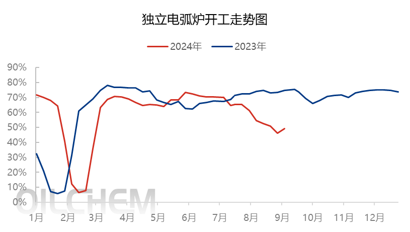 从上图我们可以,2024年电弧炉开工率同比基本处于下降的趋势,在5月、6月开工率尽管稍有上升,但进入后,电弧炉开工率直线下行。截止目前,开工率最高值为6月初的73.4%,最低值为8月末的46.15%,电弧炉开工率历经三个月,下降幅度达27.25%。自23年末,钢厂利润持续处于降低趋势,2024年延续了23年末的低开工率,而24年,房地产、基建等行业对钢铁需求度继续下降,且钢厂库存量仍居高位,减产情况继续增加,电弧炉开工率继续下降。