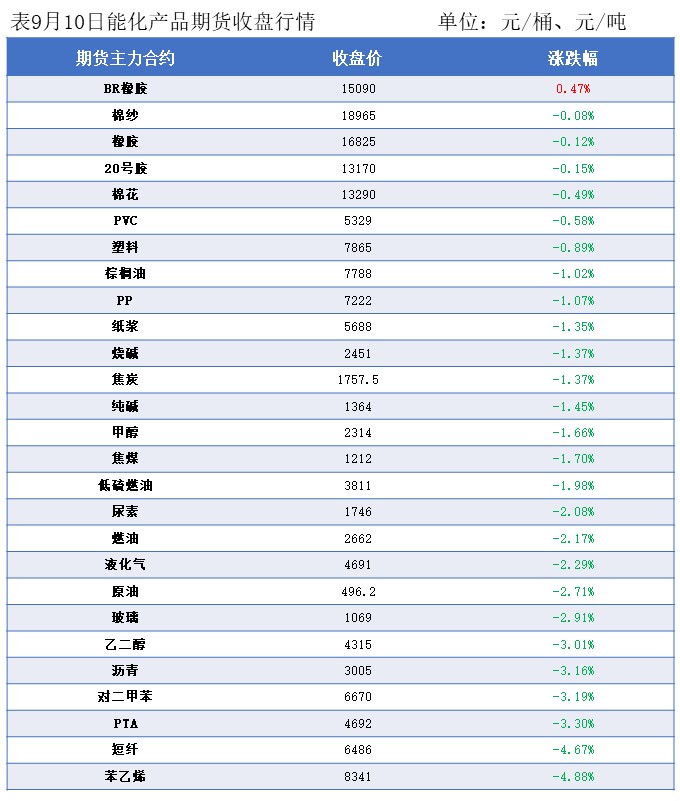 9/10: opec月报下调全球 需求增速预测,抵消美湾地区飓风带来的潜在供应风险,国际油价跌至33个月以来的最低点。nymex 10合约65.75跌2.96美元/桶或4.31%;ice布油期货11合约69.19跌2.65美元/桶或3.69%。中国ine原油期货主力合约2411跌1.7至508.7元/桶,夜盘跌14.2至494.5元/桶。