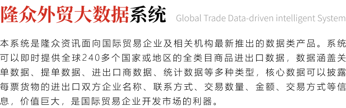 帮您全面了解全球主要经济体各类目商品的国际货物流向,及时掌握市场变化,助力系统用户在国际贸易中掌握先机,遥遥领先!